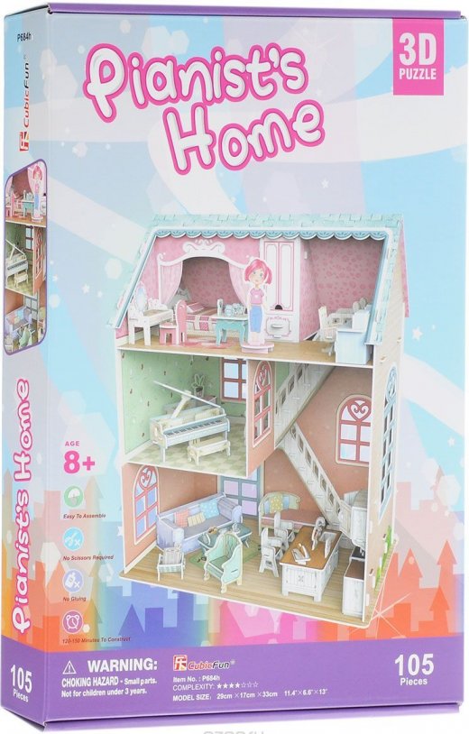 Помещение состоит из нескольких комнат, внутри которых есть все необходимое для проживания пианистки: трюмо, кроватка, стол для работы, кресла, пианино. В одной из комнат можно увидеть саму пианистку. Пазл выполнен из прочного картона, он легко собирается. Такое занятие надолго увлечет ребенка в свою сборку с головой и подарит ему массу положительных впечатлений, а также и хорошее настроение. Получившийся домик можно будет поставить на полку, как часть интерьера или как сувенир.
