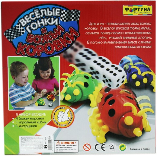 В настольной игре «Весёлые гонки и божьи коровки» игроки на скорость собирают своих божьих коровок! Броском кубика определяется то, какую еще часть игрок может добавить в яркое насекомое. От того, как игрокам будет благоволить удача, зависит исход всей игры.