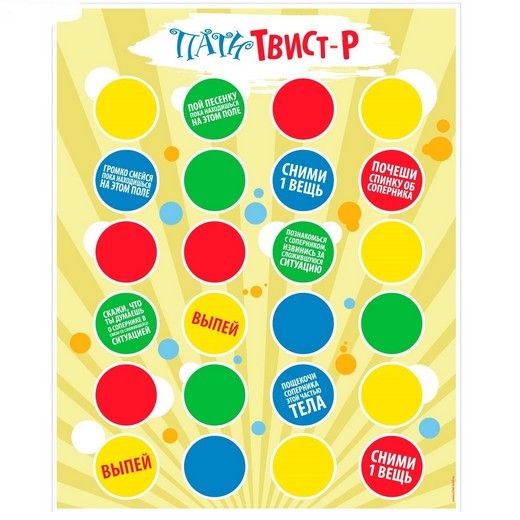 В Пати Твист замечательно играть на встречах, вечеринках и праздниках, где собрались участники свыше 18 лет и запаслись алкоголем, веселым настроением и азартом! "АлкоТвистер" - получиться ли у тебя стать самым крутым и устоять на поле, выпивая алкоголь и выполняя отвязные задания твистера.