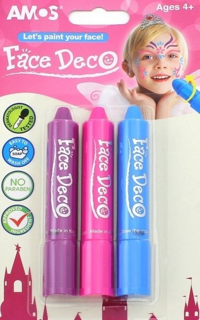 Возможность перевоплотиться в настоящую принцессу дают мелки от компании Amos! Яркие и очень удобные в использовании, они отлично подойдут для детей в возрасте от 4-х лет. Удобны в использовании, не крошатся, яркие и насыщенные цвета, высокая покрывающая способность. Мелки находятся в тюбиках, но их не составит труда достать из держателя – выкручиваются они как помада. Данный набор не представляет опасности для кожи вашего ребенка, хорошо отстирывается от одежды и легко смывается с лица.