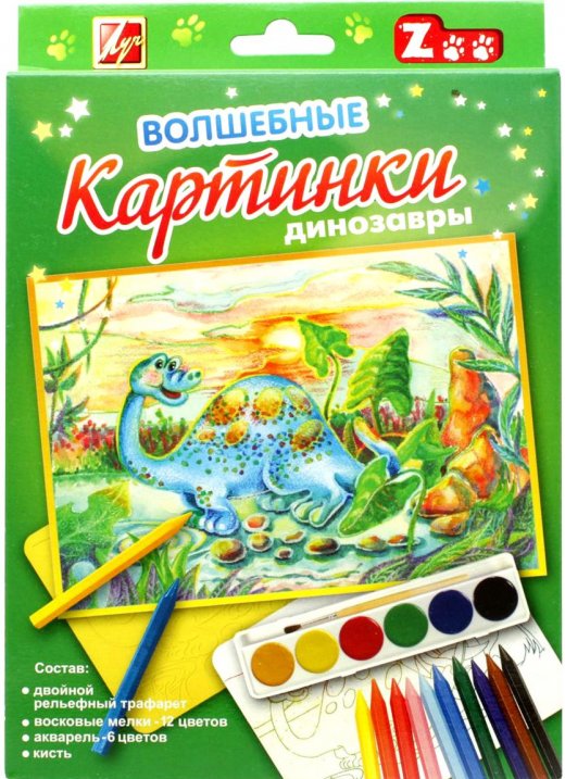 Набор для рисования Волшебные картинки Динозавры – предназначен для работы в смешанной технике, основанной на удивительном сочетании восковых мелков и акварельных красок, в результате которого получаются удивительно яркие и красивые рисунки.