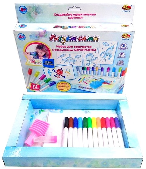 Состав набора: 12 фломастеров, насадка-аэрограф, 8 трафаретов, 6 листов бумаги.