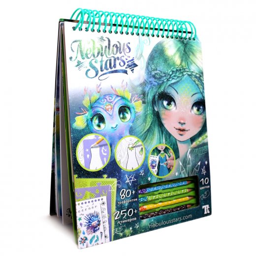 Комплектация: 45 страниц с эскизами, 80 трафаретов, 3 переводных рисунка, цветные наклейки, 5 цветных карандашей, инструкция, вкладыш с историей Nebulous Stars.