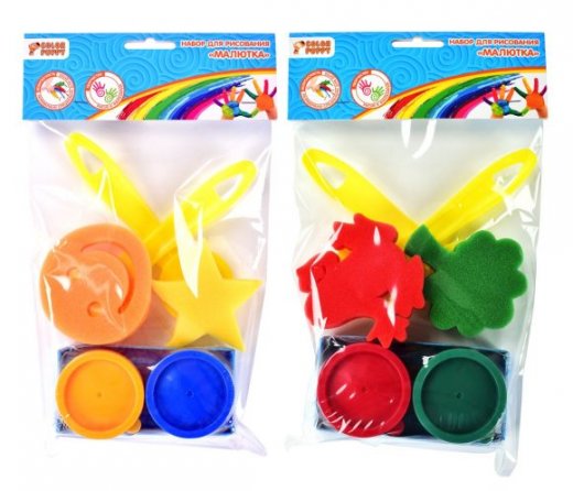 Состав набора: 2 баночки с пальчиковыми красками, 2 спонжа.