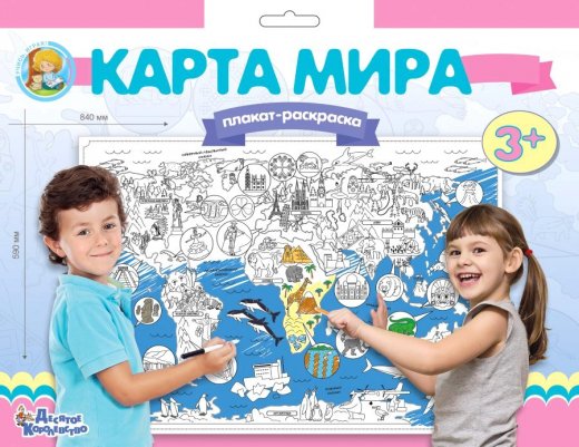 Сделайте досуг ребенка не только интересным и приятным, но и обучающим. С огромной раскраской «Карта мира» это просто! Разложите карту на полу или повесьте на стену, возьмите цветные карандаши или фломастеры (чем больше цветов - тем лучше). Создайте целый цветной мир используя свою фантазию.