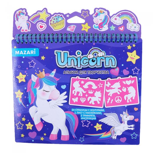 Предлагаем купить альбом для творчества "Unicorn" (Единорог) от торговой марки "Mazari" (Мазари). На его страницах изображены контурные изображения сказочных лошадей, которые необходимо раскрасить и декорировать. В этом помогут наклейки из набора, трафареты или что-то из творческого арсенала юной художницы: блестки, пайетки, стразы и другие декоративные элементы.