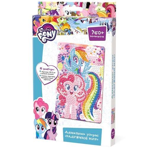 Отправляемся в блестящее путешествие в мир алмазной мозаики вместе с набором My Little Pony "Радужный мир". Сделать картинку с любимым героем мультфильма очень просто. Необходимо снять защитный слой с клеевой основы, и с помощью карандаша – стилуса приклеить стразы по номеру и цвету. Готовую картинку можно поставить на мольберт, который входит в набор. Блестящий результат восхищает всех!
