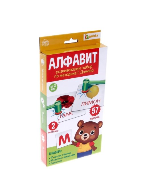 Комплектация: 17 карточек с буквами, 40 карточек с предметами, 2 млоточка.