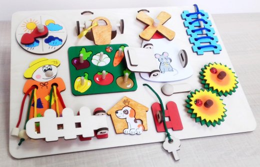 Бизиборд "Деревенька Крона" развивает воображение, логику, сообразительность и мелкую моторику.