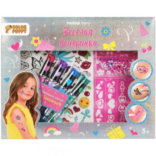 Набор для создания временных татуировок «Яркая вечеринка» от ТМ Color Puppy пригодится каждой маленькой моднице! С помощью него девочка сможет блистать на любом празднике, а также подчеркнуть свою индивидуальность и добавить образу стильный акцент.