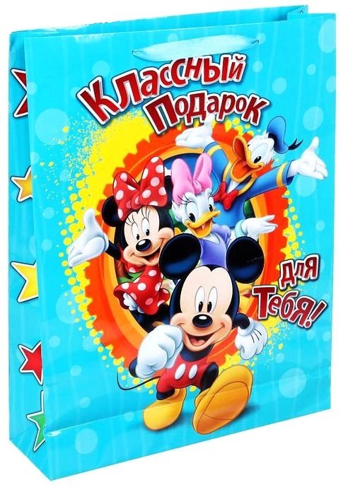 Подарочный пакет Классный подарок для тебя – можно использовать как небольшой презент или как красивую упаковку под непосредственный подарок. Ламинированные бумажные пакеты — лидеры по популярности среди подарочной упаковки. Подарки не обязательно делать только по важным поводам. Дарите их спонтанно, без причины, просто для души. Ведь главное в этом процессе — удовольствие! А сколько радости получит адресат, когда увидит пакет "Классный подарок", Микки Маус + мини-открытку с любимыми героями! Прочная ламинированная бумага с атласными ручками и уникальный дизайн делают его идеальным. Положите в него конфеты или игрушки, и ваш подарок не затеряется среди других.