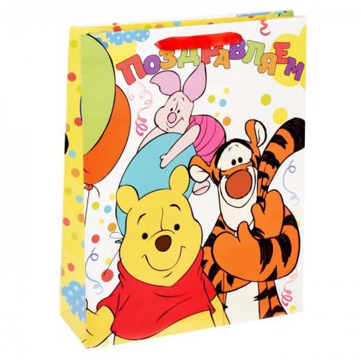 Ламинированные бумажные пакеты — лидеры по популярности среди подарочной упаковки. Выполнен он в ярких и красочных тонах, с изображением медвежонка Винни и его друзей. Благодаря качественной печати рисунок не сотрётся и не выгорит и к тому же он достаточно прочен. Так что в дальнейшем его владелец может пользоваться им по прямому назначению, для походов в магазин и т.д.