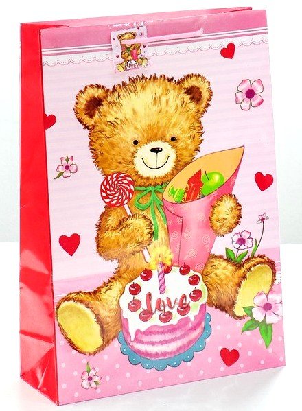 Бумажные пакеты — лидеры по популярности среди подарочной упаковки. Выполнен он в ярких и красочных тонах с изображением милого мишки и праздничного тортика. Благодаря качественной печати рисунок не сотрётся и не выгорит и к тому же он достаточно прочен. Так что в дальнейшем его владелец может пользоваться им по прямому назначению, для походов в магазин и т.д.