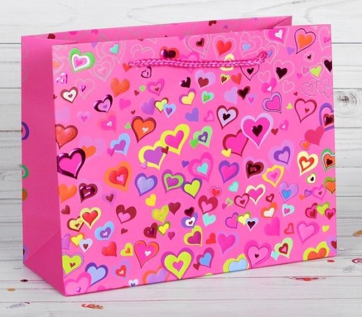 Подарочный пакет Разноцветные сердечки – сможет стать отличным дополнением к презенту. Подарки не обязательно делать только по важным поводам. Дарите их спонтанно, без причины, просто для души, ведь главное в этом процессе - удовольствие! Прочная ламинированная бумага с ручками и уникальный дизайн делают его идеальным. Положите в него конфеты или игрушки, и ваш подарок не затеряется среди других.