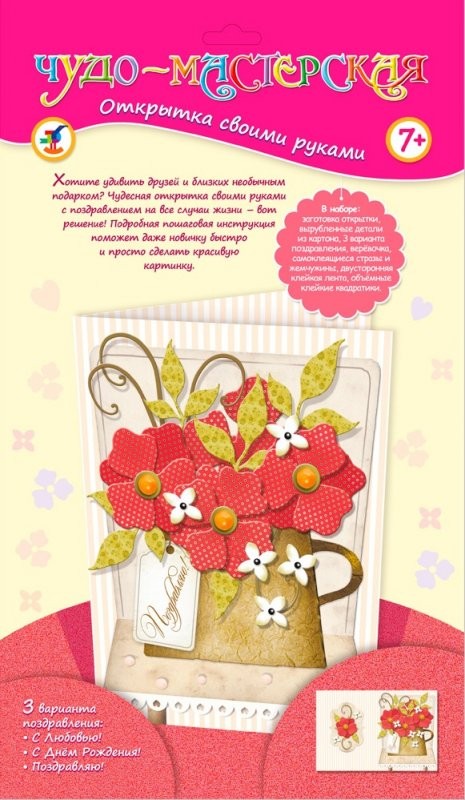 Чудесную открытку с букетом красных цветов, сделанную руками ребенка, приятно получить к любому празднику. Даже новичок в рукоделии сможет изготовить такую открытку быстро и аккуратно, в чем поможет вложенная в набор подробная пошаговая инструкция. Такую открытку можно подарить на любой случай жизни, поскольку, она имеет три варианта поздравления. Все элементы набора безопасны для здоровья ребенка.