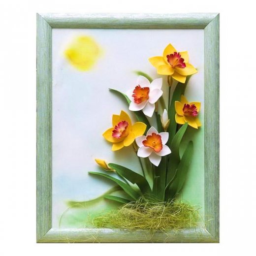 Картина из фоамирана Волшебная мастерская – это букет ароматных нарциссов, тянущихся к теплому весеннему солнцу. Используйте разные техники творчества, чтобы создать удивительное украшение интерьера! Эластичный полимерный материал легко режется и гнется, он аккуратно сгибается и хорошо держит форму. Изделия из фоамирана не боятся воды и растягиваются при нагревании – это дает большой простор для творчества.