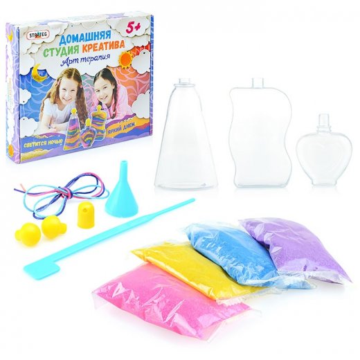 Создание объектов из песка это увлекательное занятие, которое помогает ребенку раскрыться, дарит вдохновение и позитив. Креативный набор Арт терапия это домашняя студия креатива, созданная для любознательных и умных детишек. Набор состоит из полимерных фигурных бутылок, цветного декоративного песка, воронки, цветного каната и крышек.