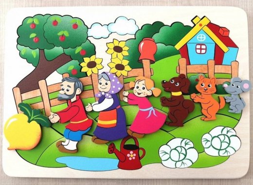 Мозаика сказка "Репка"- пазл-головоломка, детали пазла разного размера и формы. Мозаика создана по мотивам русской народной сказки "Репка". Персонажи сказки съёмные фигурки, которыми можно играть отдельно, они одеваются на основное поле с помощью деревянных дюбелей.