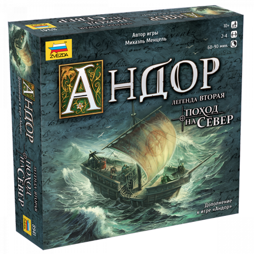 "Андор. Легенда вторая: Поход на Север" – первое большое дополнение к настольной игре Андор. Новое двустороннее поле позволит участникам разыграть две большие легенды на каждой из сторон. Сначала игрокам предстоит покорить ревущий океан, исследовать таинственные острова и защитить их берега от морских чудовищ. Завершив морское путешествие, герои попадут на вторую сторону игрового поля – в заснеженную Хадрию.