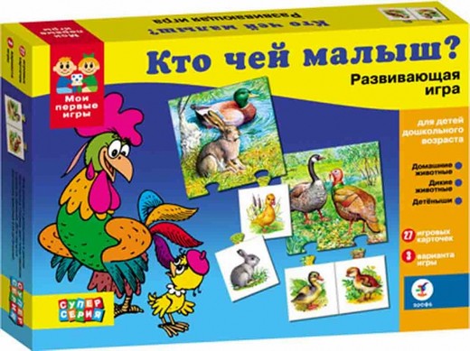 Мои первые игры "Кто чей малыш"- игра знакомит с домашними и дикими животными и их детенышами, дает представление о среде их обитания. В состав игры входит 9 больших карточек с изображением животных на фоне природы. На каждой карточке нарисовано 2 животных: утка-заяц, слон-лев, кошка-коза, кенгуру-коала, кабан-медведь, лошадь-корова, свинья-курица, собака-овца, индюшка-гусь. И 18 маленьких карточек с изображением детенышей. Животные нарисованы реалистично.