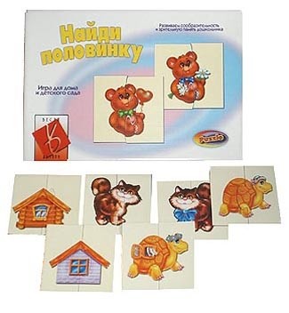 Найди половинку Настольно-печатная игра – это занимательный и весьма интересный подарок для ребенка. Собирать пазлы любит каждый малыш. Картонные карточки размером 10х10 см. порезаны как пазлы только на 2 половинки, зато картинки подобраны таким образом, чтобы создать для ребенка познавательную задачу: многие половинки очень похожи, но замочки закроются, лишь в том случае, если будут учтены все частности. Игра может быть предложена очень маленьким детям – уже в 2 года, тогда похожие картинки надо будет убрать. Позже можно будет не только решать задачи в полном объеме, но и учиться отвечать, почему именно эти половинки подходят друг другу.