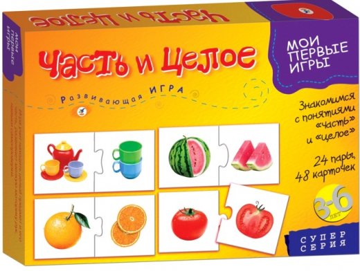 Часть и целое Мои первые игры – это развивающая игра для детей дошкольного возраста. Правила игры просты: соединение двух элементов карточки в одну по принципу "целое - часть" с помощью пазлового замка. В обучающую игру "Часть и целое" одновременно могут играть несколько детей. Она учит находить недостающие детали и складывать изображение из нескольких частей. Ребенок узнает, чем отличается часть и целое, научится выделять и соединять части предметов. Игра состоит из 48 картонных карточек. В ходе игры их нужно правильно собрать 24 пазла. Фигурные замки помогут ребенку самостоятельно проверить правильность своих ответов.