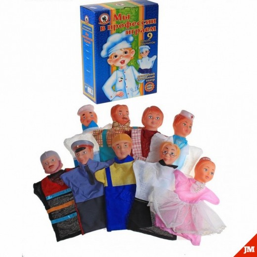 Этот кукольный театр необычный. Все его герои - это люди разных профессий. Всего в комплекте 9 кукол-перчаток. Несколько легко узнаваемы, это: милиционер, повар, врач, балерина, пожарный и строитель. Три оставшиеся куклы могут представлять разные профессии, авторы в разных сценариях дают им роли архитектора, портнихи, программиста, парикмахера, фермера. В своих постановках Вы можете сами придумать их род занятий. Кроме кукол, в комплект входит брошюра с описанием. В описании приведено три сценария для постановки спектаклей.