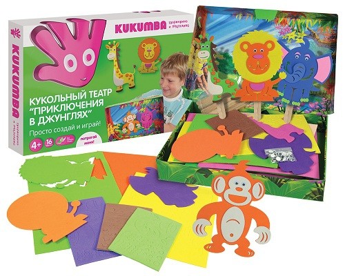 У тебя появилась возможность создать свой кукольный театр. Все, что для этого нужно, находится в этом наборе: артисты и готовые декорации. Осталось придумать веселые приключения для слона, льва, обезьяны и жирафа. Устрой представление для своих родителей, а потом для всех-всех-всех. Сделать кукольный театр дома просто, следуй инструкции и фотографиям. Материал: вспененный этиленвинилацетат (ЭВА) на клеевой основе.