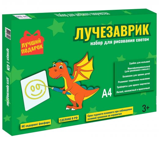 Набор для рисования светом "Лучезаврик", предназначенный как для детей так и для взрослых. На водонепроницаемом планшете можно рисовать шедевры с помощью ручки-фонарика и ваши произведения искусства не стираются до 30 минут. В комплекте идет трафарет для самых маленьких художников. И что немаловажно планшет не имеет срока годности и состоит из безопасных, не горючих материалов без содержания тяжелых металлов.