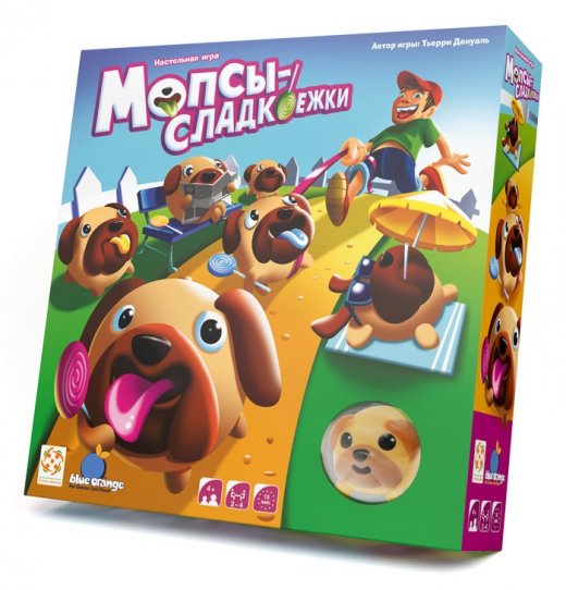 Комплектация 4 планшета игроков, 12 мопсов, 2 кубика с символами леденцов на гранях; правила игры