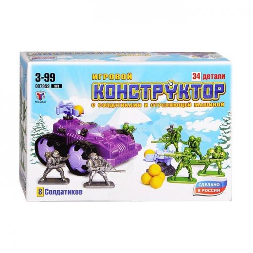 "Конструктор с солдатиками и стреляющей машиной №1" состоит из 34 деталей, из которых ребенку следует собрать невероятную стреляющую машину. Набор отлично подойдет любителям военной тематики. Машинка оснащена пушкой, которая стреляет желтыми шариками. В комплекте также имеется 8 солдатиков двух разных видов, благодаря чему можно будет устраивать настоящие войны между ними.