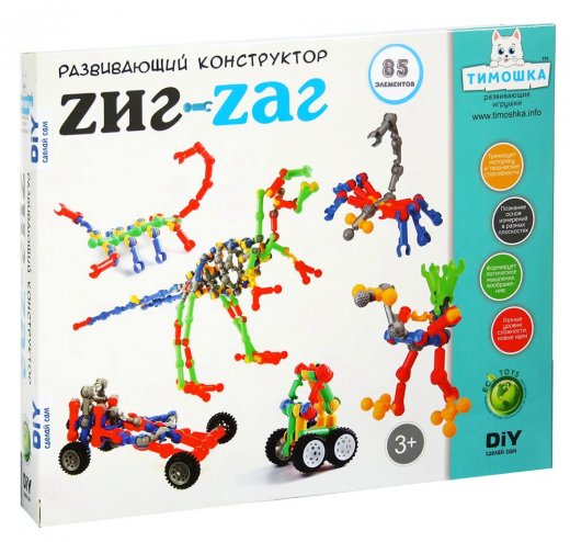 Увлекательный 3D конструктор «ZигZаг» с его необычными креплениями позволит ребенку проявить фантазию и собирать любые объемные фигуры на свое усмотрение: различных животных, технику, геометрические фигуры, строения и др. При этом животные будут не просто стоять как статуэтки, а и с помощью ребенка смогут оживать, двигать лапками, хвостом, головой и т.д. Конструктор «ZигZаг» может использоваться как наглядное пособие, например, для изучения геометрии, так как с его помощью можно увидеть и понять чем отличаются призма и пирамида, что такое точка, прямая и стороны фигуры.