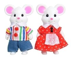Фигурки семьи мышек "Happy Family", что переводится как счастливая семья, одеты в милые домашние костюмчики, детально и тщательно проработанные. Мышка-девушка одета в красное платье в горошек с белым воротником и парой пуговиц на груди. На поясе у нее надет передник с вышитыми узорами по подолу. Ее мыш-супруг щеголяет в джинсах и полосатой рубашке с большими красными пуговицами. Фигурки являются частью большой серии игрушек, в которой можно найти другие семейства зверят, а также домики, мебель и аксессуары для них.