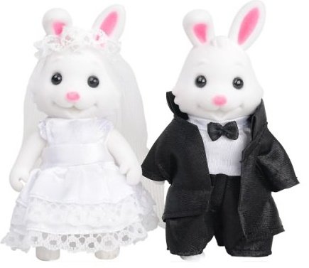 Игровой набор HAPPY FAMILY Зайцы – что переводится как счастливая семья, одеты в милые домашние костюмчики, детально и тщательно проработанные. Зайка-девушка одета в великолепное белое свадебное платье. Ее зайчик-супруг щеголяет в черном строгом костюме и с бабочкой на шее. Фигурки являются частью большой серии игрушек, в которой можно найти другие семейства зверят, а также домики, мебель и аксессуары для них.