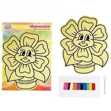 В набор входят: пластиковая основа с нанесенным контуром, набор цветного песка (10 цветов по 5гр), стек.