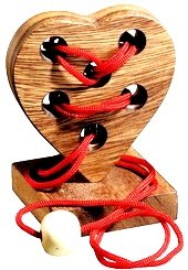 Головоломка Ребус Любви – послужит интересным и занимательным подарком, как для юного любителя интеллектуальных задачек, так и для взрослого. Эта логическая головоломка выполнена из качественного дерева, гладкого и приятного на ощупь. На подставке установлено деревянное сердце с отверстиями, сквозь которые продет шнурок, да еще и запутан. Нужно будет распутать все узелки и переплетения и снять шнурок.