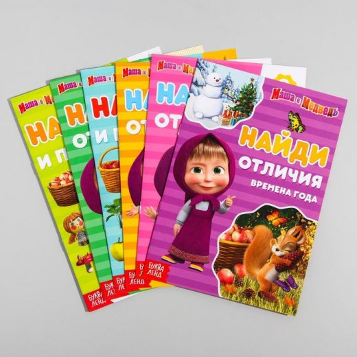 Находите отличия вместе с любимыми героями мультфильма "Маша и Медведь"! В набор входит 6 книг "Найди отличия" по 12 страниц. Данные книги помогают развивать внимательность, а так же знакомят ребенка с окружающим миром в игровой форме!