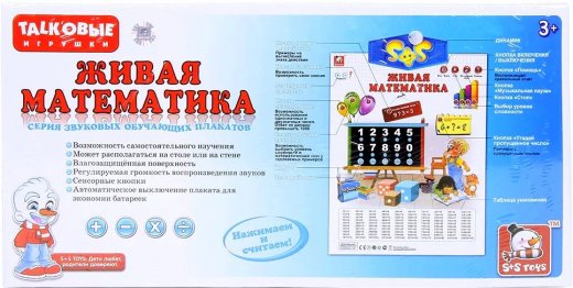 Электронный плакат Живая математика –поможет вашему малышу освоить счет, научиться прибавлять, умножать, складывать и делить. Живая математика предоставляет ребенку возможность самостоятельного изучения. Ее можно расположить на столе или стене, имеет влагозащищенную поверхность. Громкость воспроизведения регулируется. Для экономии батареек плакат автоматически выключается. Плакат имеет 3 режима работы и 4 уровня сложности: