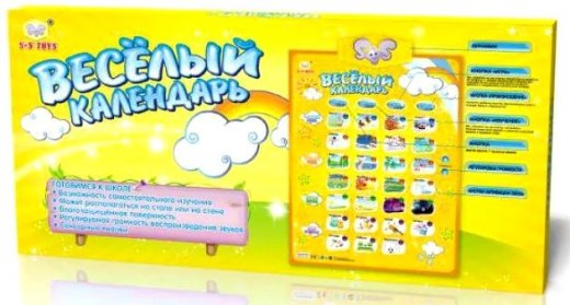 Электронный плакат Веселый календарь – поможет расширить кругозор ребенка и познакомит его с множеством интересной информации. На нем нарисованы картинки, соответствующие временам года, месяцам, времени суток и дням недели и есть кнопки, нажав на которые, можно это все воспроизвести. Плакат работает в 3 режимах: изучение (названия озвучивается без описаний и объяснений), произношение (слова произносятся по буквам) и игра (ребенку читается стих с вопросом, на которой нужно выбрать ответ). Модель защищена от воздействия влаги и оборудована функциями регулировки громкости и автоматического отключения после 15 секунд бездействия, на случай если ребенок забудет отключить плакат по завершению игры.