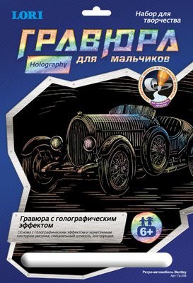 Гравюра для мальчиков. Ретро-автомобиль Bentley (голография) LORI. Контур рисунка уже нанесен на черный фон. С помощью специального штихеля изображение процарапывается, и из-под слоя краски появляется переливающаяся основа. В результате получается рисунок с изображением ретро-автомобиля "Bentley".