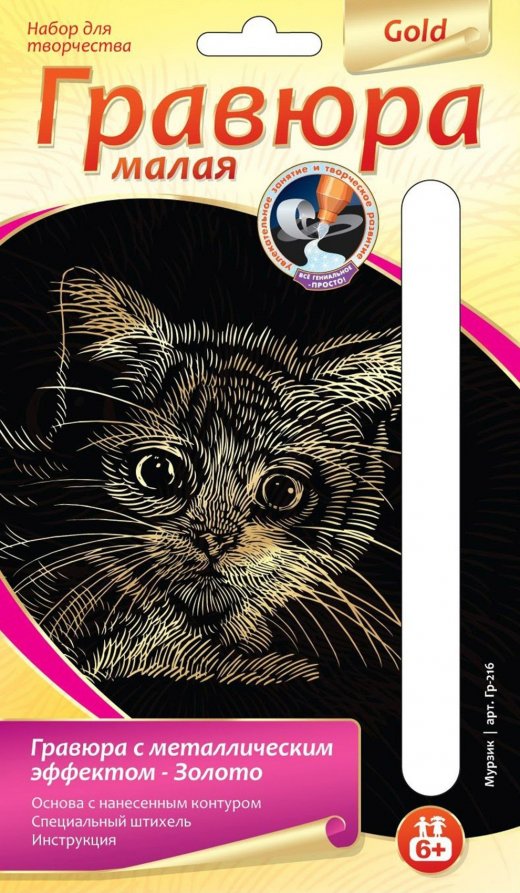 Гравюра малая Мурзик – это весьма интересный и занимательный подарок для ребенка, который любит творчество и поделки своими руками. Делать гравюру ребенку будет непременно интересно. На черном фоне изображены контуры рисунка - юному мастеру нужно сцарапать их с помощью штихеля, и вы увидите, как котик засияет золотым свечением! Этот набор для детского творчества раскроет перед ребенком секреты мастерства создания гравюр и поможет создать милую картинку. В набор входят все необходимые элементы и материалы. Такая замечательная картина сможет стать хорошим дополнением к интерьеру комнаты.