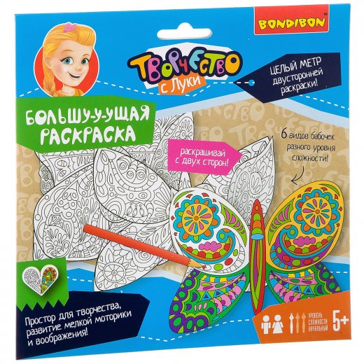 Творчество с Луки Большущая раскраска Бабочки – это весьма интересный и занимательный подарок для ребенка, который любит творчество, ведь это целый метр двусторонней раскраски. В наборе шесть различных бабочек, соединенных между собой и образующих гирлянду. Раскрашивая участок за участком, ребенок придумывает неповторимые сочетания цветов, развивает фантазию и усидчивость