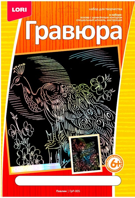 Гравюра Павлин - содержит все необходимое для создания собственного произведения искусства. В комплект входит основа, на которую нанесена краска с контуром рисунка, специальный штихель и инструкция на русском языке. Контур изображения уже нанесен на фон основы. С помощью специального штихеля изображение процарапывается по контуру, и из-под черной краски появляется основа с голографическим эффектом. В результате получается эффектное контрастное изображение грациозного павлина.