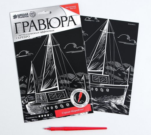 Гравюра Яхта – это весьма интересный и занимательный подарок для ребенка, который любит творчество и поделки своими руками. Это необычный способ создания картин-гравюр. На алюминиевую пластину нанесено изображение. При помощи ручки-гравера ребенок аккуратно штрихами по рисунку снимает верхний слой. Таким образом, в результате кропотливой, но весьма увлекательной работы, ребенок получит оригинальный рисунок с изображением яхты.