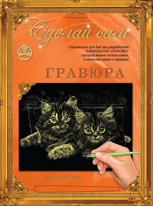 Гравюра "Котята золото" содержит в комплекте основу с нанесенным контуром, специальный штихель и инструкцию. Контур рисунка уже нанесен на черный фон. С помощью специального штихеля изображение процарапывается, и из-под слоя краски появляется серебристая основа. В результате получается контрастный рисунок с эффектным изображением котят.