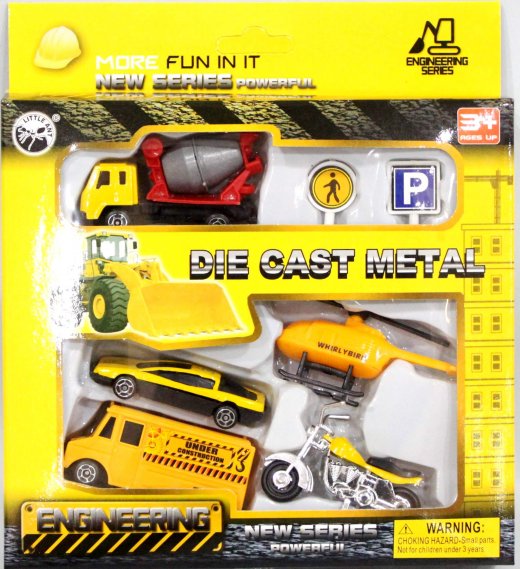Набор строительной техники металл 7 предметов – это отличный подарок для любителя машин и строительной техники. Игровой набор Die Cast Metal состоит из семи игрушек. Эти игрушки - бетономешалка, микроавтобус, легковая машинка, вертолет, мотоцикл и специальные знаки, объединяет тема стройки и технических работ.