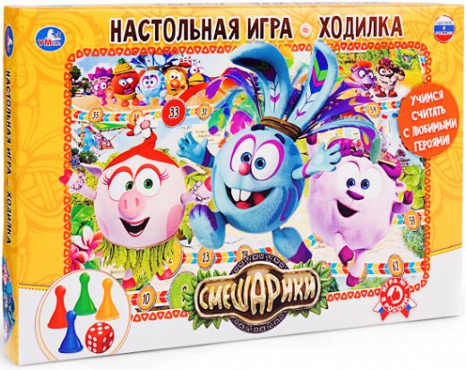 Настольная игра-ходилка Смешарики подойдет для самых маленьких деток от 3 лет и поможет научиться делать элементарные арифметические операции.
