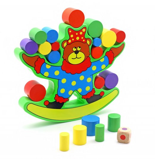 Балансир "Мишка-весы" знакомит детей с таким понятием как равновесие. В комплект входит качающаяся база в виде мишки, 20 деревянных цилиндров трех размеров и игральный кубик с точками разного цвета. После каждого броска кубика нужно подобрать цилиндр соответствующего цвета и разместить его на базе так, чтобы мишка сохранял равновесие и ранее размещенные цилиндры не упали с него.