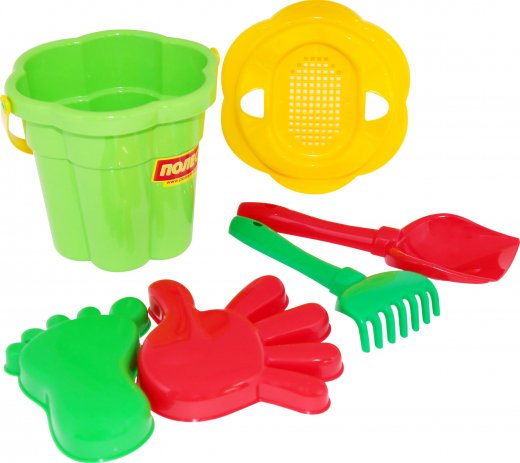 Состав набора: ведро-цветок, ситечко-цветок, лопатка, грабельки, формочки.