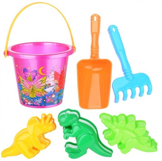 Набор идеально подойдет для игры в песочнице. В комплекте имеется все необходимые: здесь есть и формочки, которые выполнены в виде забавных динозавриков, грабельки, совочек и ведерко. Все элементы отличаются яркими цветами, а также наличием декоративных деталей: на ведерке, к примеру, присутствует красивая наклейка, на которой можно разглядеть бабочек, порхающих на лугу.